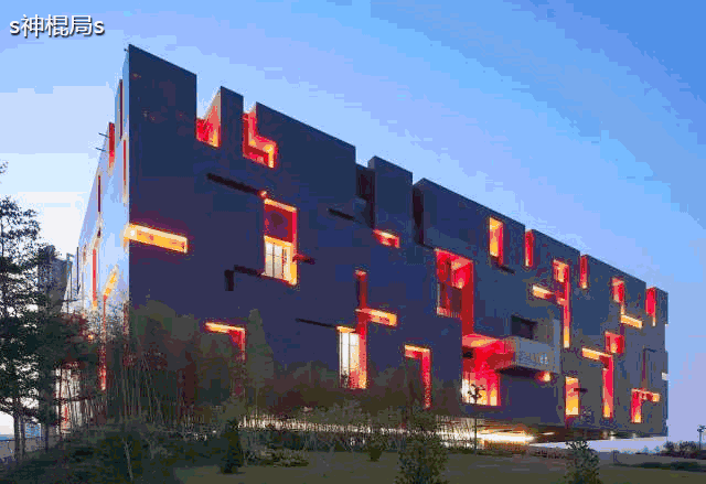 另外,在外形下凹的缝隙和内墙则是用了大红色的"火属性"墙体和灯光,在形态风水上犹如一个巨大的“火焰印玺"。