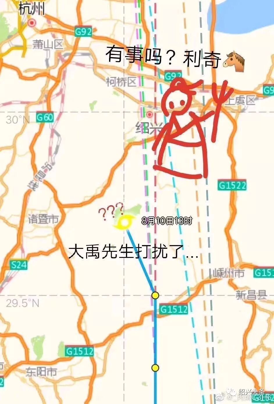 大禹在此,你必绕道。神了,到稽东附近突然转向往富阳方向了